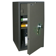 Изделие соответствует I классу устойчивости к взлому и сертифицировано по ГОСТу. Двухслойный стальной корпус заполнен материалом SMREKOLIT, конструкция имеет возможность закрепления, как на полу, так и на стене. Запорный механизм защищен от выбивания и усилен пластиной из специального сплава с высоким содержанием марганца.